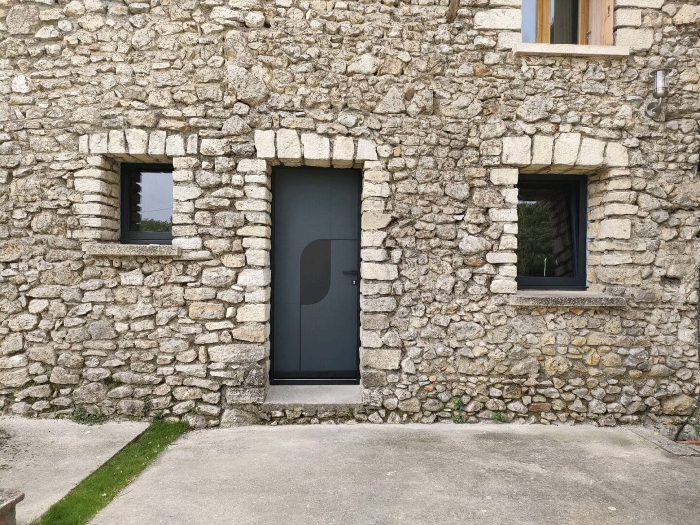 Installation de fenêtres en composite gris Anthracite fabriqué sur mesure en France assortie à la porte d’entrée en aluminium.