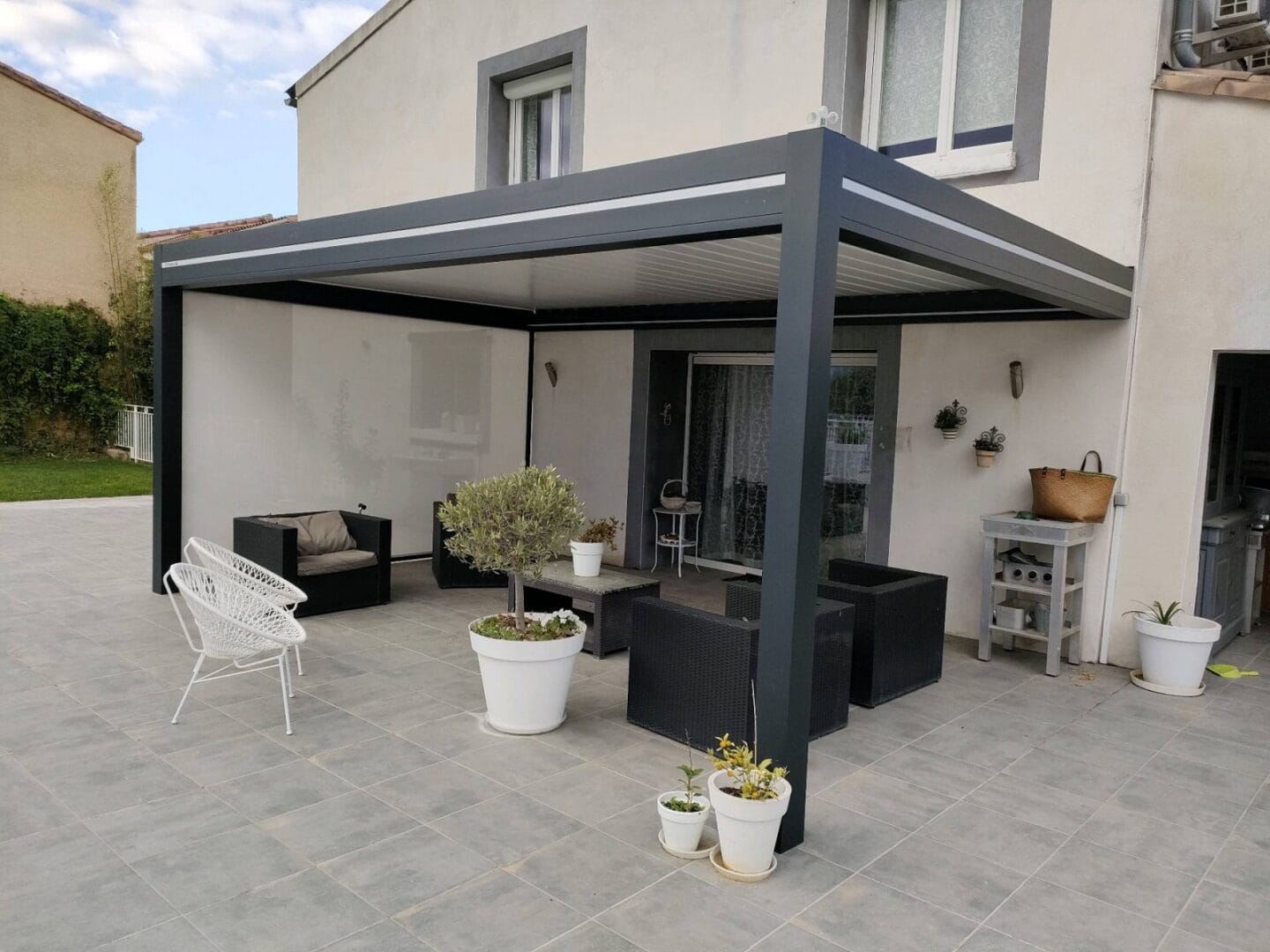 Comme ici chez un de nos clients du Cailar qui a fait le choix d’une pergola bioclimatique en aluminium accompagné de certaines options qui sont possibles d’installer :