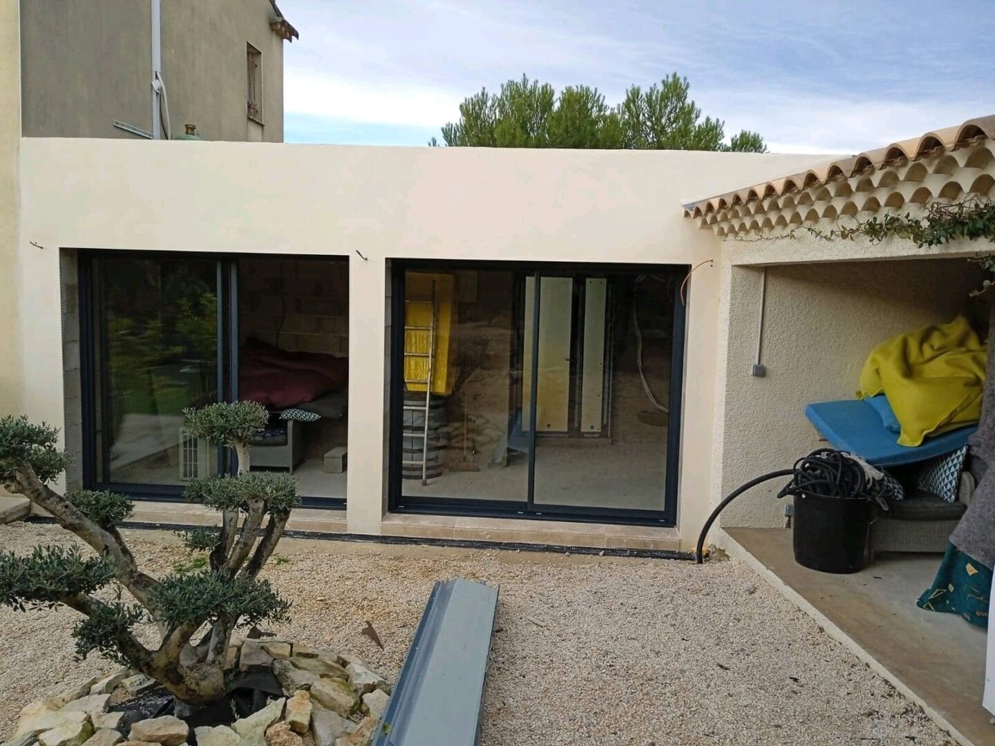 Nos équipes on installait 2 baies coulissantes en aluminium sur mesure. Pour ces deux baies coulissantes nos clients ont choisi la couleur gris anthracite 7016 pour être en harmonie avec le reste de leur maison.